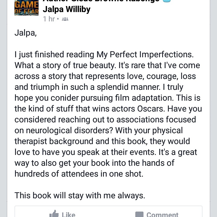 But, do you know what’s really been incredible? I’ve met some amazing people online because of all of my writing endeavors. I was lucky enough to meet my friend, Charisse Hogan. Because of her, I was inspired to write My Perfect Imperfections. She is a remarkable young woman with cerebral palsy, and each day, I am in awe with her strength, beauty, and positive energy. Here’s the link of her YouTube video when she reviewed My Perfect Imperfections: https://www.youtube.com/watch?v=j4WPNs5cYJ4